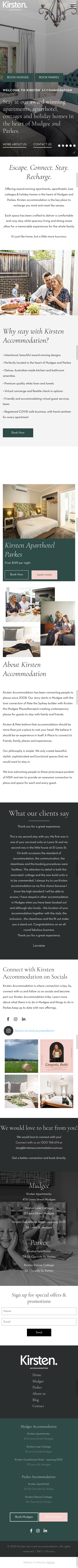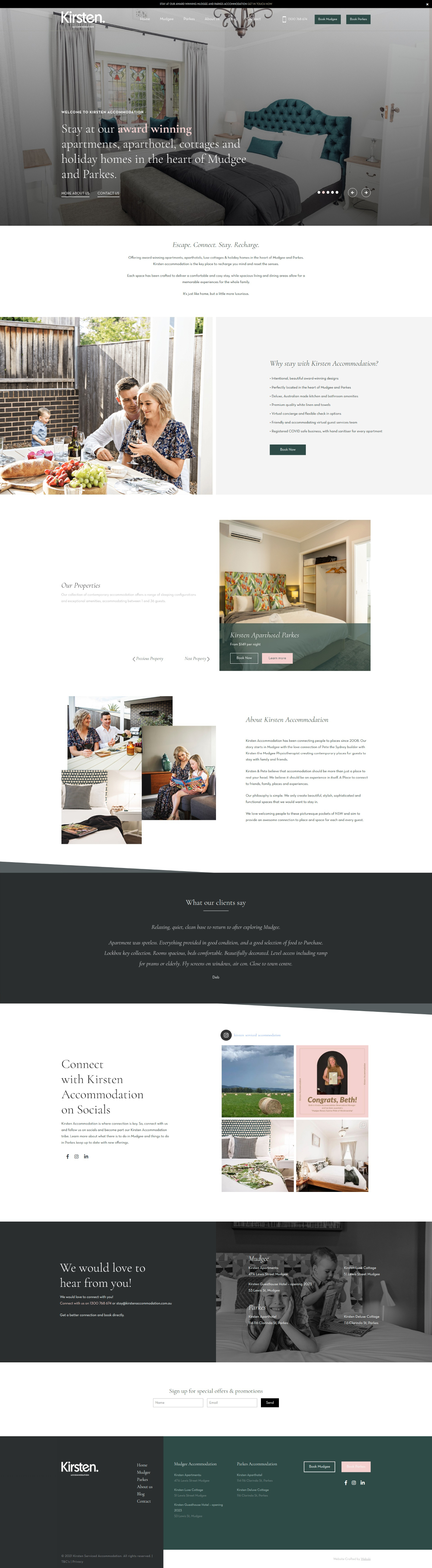 Kirsten Accommodation is a award-winning apartments, aparthotels, luxe cottages & holiday homes in the heart of Mudgee and Parkes. Kirsten is our long term partner and over the years we’ve designed and developed three versions of their website, always trying to keep up with the latest technology and trends in the Web Design. Since we have a great experience with Hotel Web Design by creating over 50 websites in the hospitality industry we knew what Kirsten will need for their new website. We have a special relationship with the team at Kirsten and we’re really grateful that we have a client that can always trust us and rely on us about everything related to Web Design and Development.