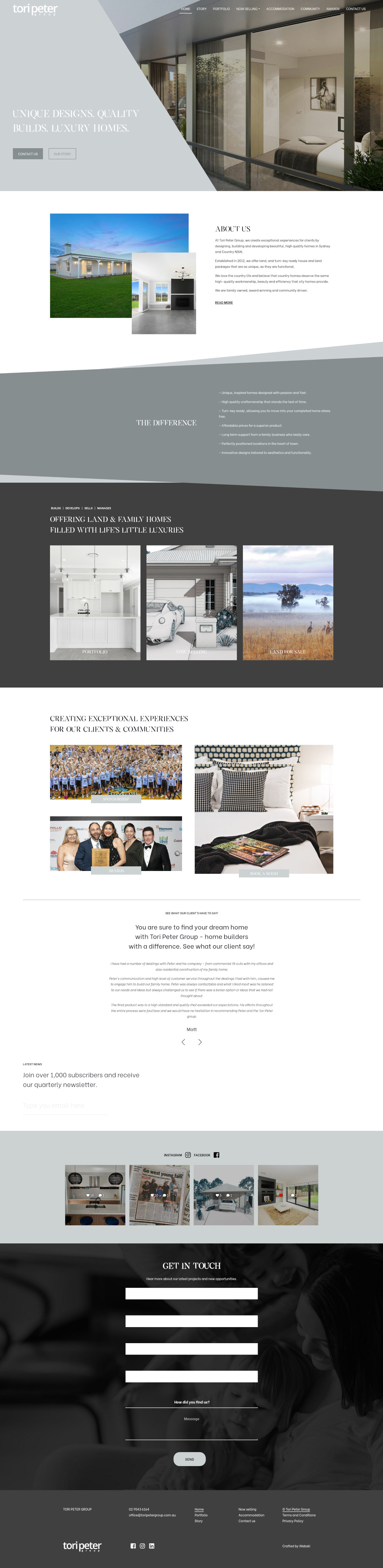 Tori Peter Group is not our new client we’ve already made a great website for Kirsten Accommodation – owned by Tori Peter Group. This time we had to come up with a design that will represent all of their services including home design, home building and accommodation, showcase their portfolio and their commitment to the community.